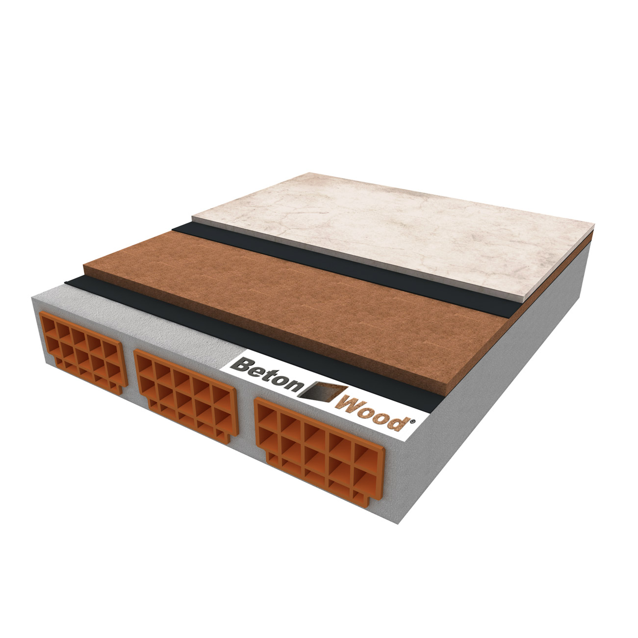 Sistema completo per solaio e sottotetto con doppio strato in fibre di legno FiberTherm densità 160kg/m³ con barriera antivapore multi UDB sopra e sotto i pannelli in fibre di legno ed uno strato in cementolegno ad elevata resistenza a compressione (circa 2000 kPa) e densità 1350kg/m³. Il sistema di massetto a secco calpestabile poggia su solaio in laterocemento.